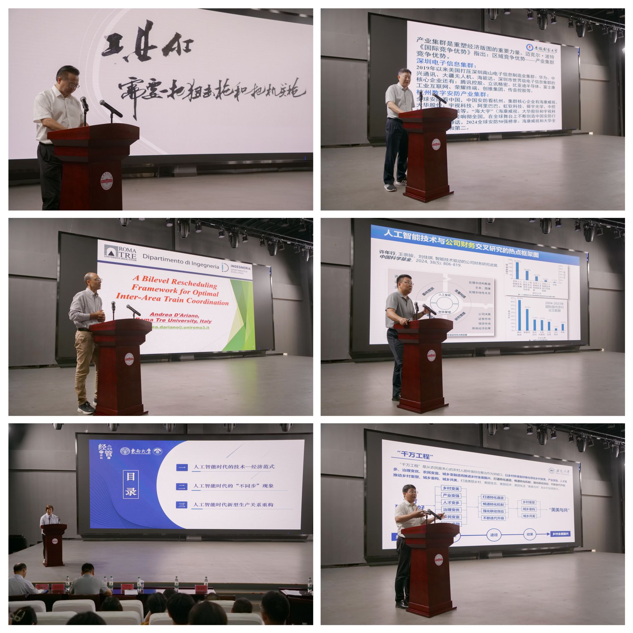 大会主论坛上,安徽省工业和信息化厅二级巡视员潘峰、安徽财经大学原副校长冯德连教授、上海外国语大学马宝君教授、罗马第三大学Andrea D'Ariano教授、东南大学国家发展与政策研究院理事长袁健红教授、安徽大学中国乡村振兴研究院院长崔宝玉教授分别作题为《工业AI需要一把狙击枪和一把机关枪》、《长三角培育世界级先进制造业集群的优势与路径》、《人工智能方法赋能商科学术研究探索:以企业社会责任报告分析研究为例》、《一种实现最优区域间列车协调的双层调度框架》、《人工智能时代的新型生产关系探索》、《安徽省践行“千万工程”—成效、挑战与路径》的主旨报告。校学术委员会副主任、小说网
